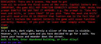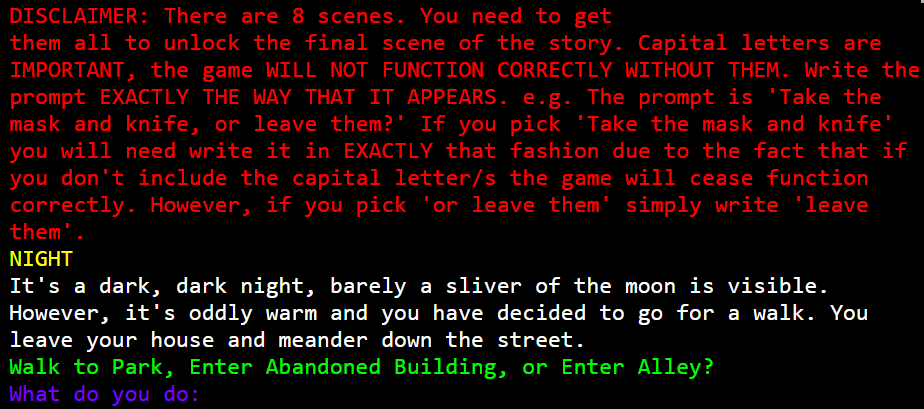 Description: Simple, short text-based adventure game. Part 1 of trilogy.